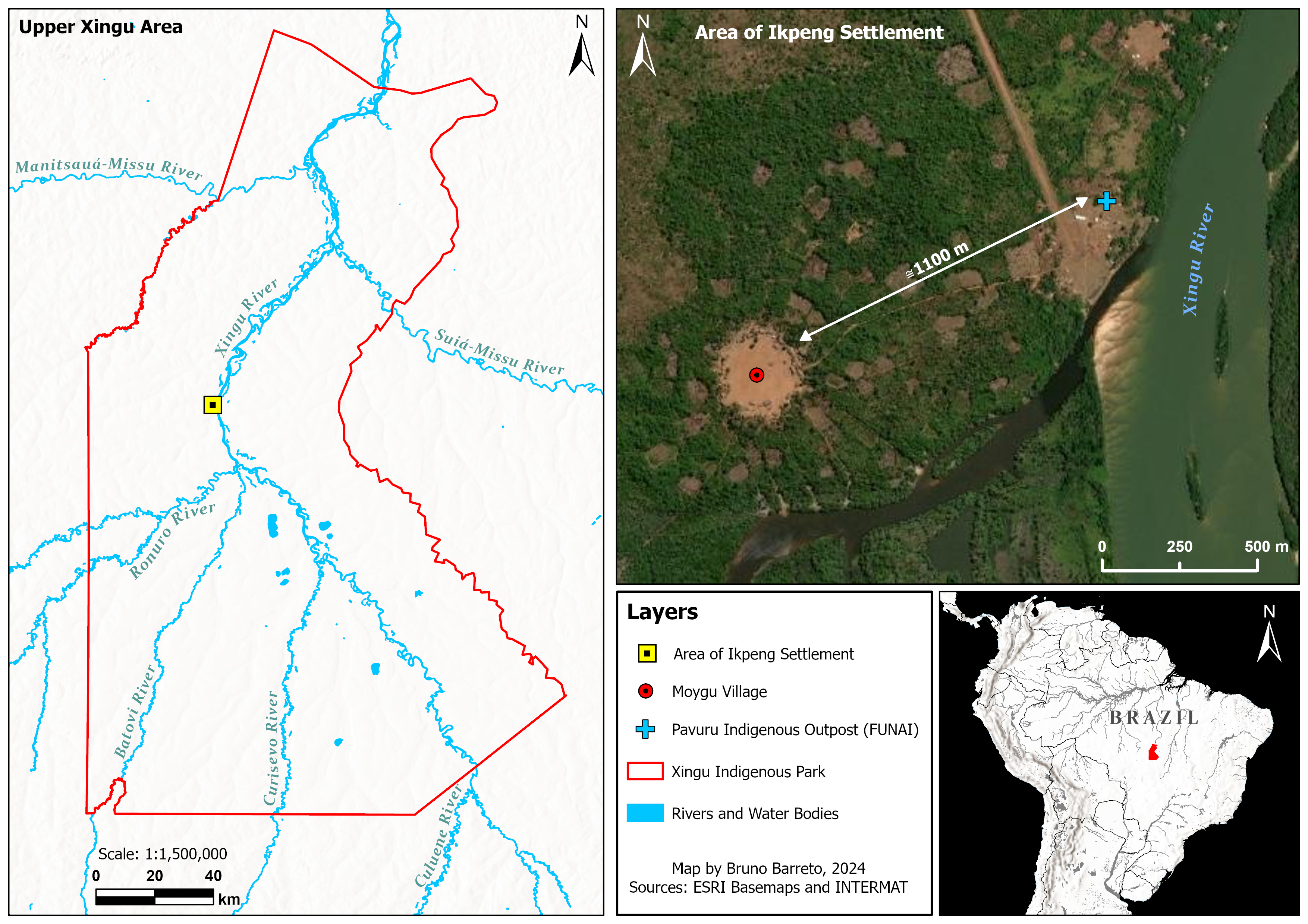 Figure 1: Map depicting the location of the main Ikpeng village, Moygu, within the limits of the Xingu Indigenous Park. The location of the reservation in Central Brazil is also indicated. A satellite image shows the village of Moygu (with circular central plaza), the Pavuru Indigenous Outpost with its airstrip, and the Xingu river nearby.