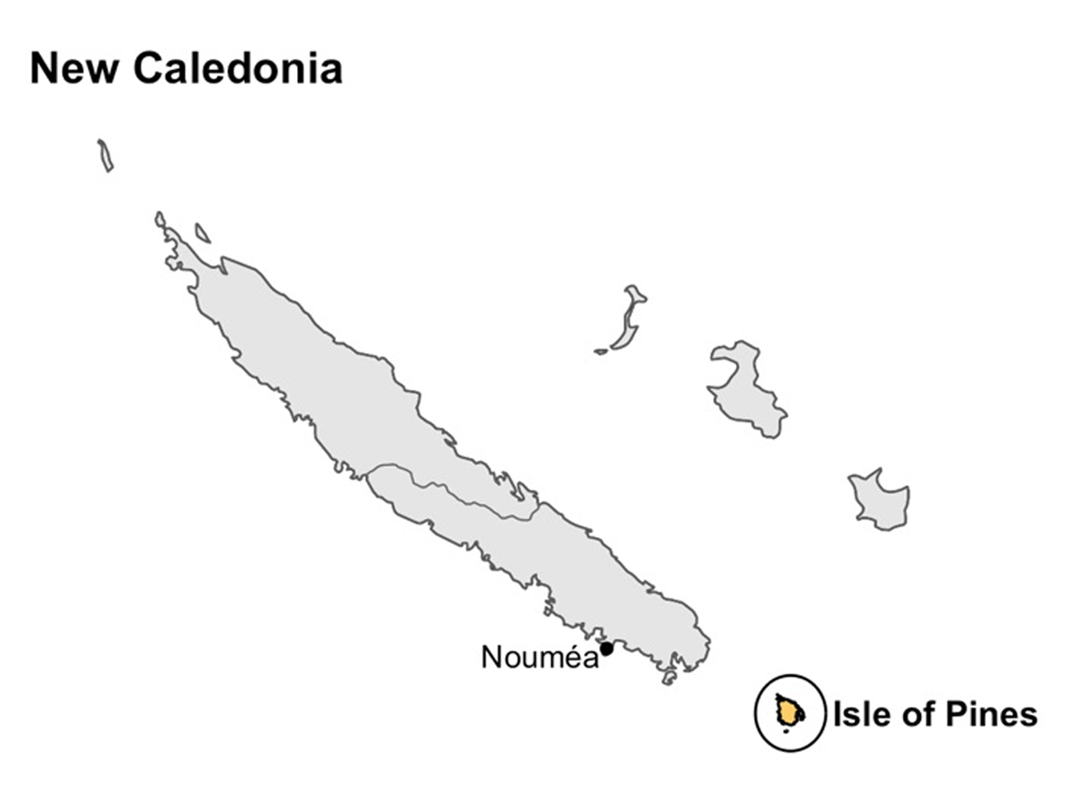 Kwényï or Nââ Kwényï (/na: kʷɛɲi/ ‘the Kwényï language’) is a Far Southern-Eastern Oceanic language spoken by around 2000 people on the Isle of Pines in New Caledonia, a French overseas territory 1500 kilometres east of Australia in the Pacific Ocean. The Isle of Pines lies southeast of the Grande Terre, New Caledonia’s main island, as shown in the map in Figure 1. Glottolog classifies nââ Kwényï along with nââ Wêê spoken on Ouen Island as a dialect of nââ Numèè (Hammarström et al. 2022). However, as Geraghty (1989) points out, the subgrouping of New Caledonian languages has generally been adopted without explicit evidential argumentation. By contrast, Rivierre (1973) describes nââ Numèè, nââ Kwényï, and nââ Drubéa as languages that through contact have diversified from a common root. The Kanak Language Academy groups these languages within the Drubéa-Kaponé aire coutumière ‘customary area’, a legally recognized region of New Caledonia that classifies the Kanak tribes of the far south and their associated languages together for language planning purposes (Académie des Langues Kanak n.d.b).