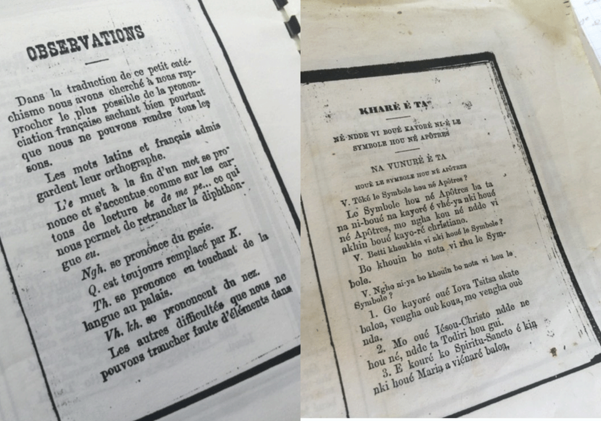 Early Protestant missionaries attempted to translate the Gospels into Kwényï in 1847 and managed to publish a list of words in 1861, but it was Father Goujon’s translation and publication of a catechism using a partly Gallicized orthography (see Figure 2) that marked the scientific study of the language in 1888 (Pisier 1969). Linguistic studies of Kwényï were later carried out by Leenhardt (1946) and Grace (1955) as part of a larger survey of New Caledonian languages, followed by the more detailed studies of Far Southern New Caledonian languages by Rivierre (1973) and Dubois (1977). The Pangloss Collection preserves a Kwényï narrative recorded in 1967, Story of Mâgénîînê by Kotere Bénédicto (Kotere 1967), offering valuable evidence of the language as it was spoken in the mid-20th century. A proposed orthography for the language was published by the Academy of Kanak Languages in New Caledonia (Gouraya et al. 2011), and Wacalie (2013) provides an updated description of a closely related Far South Kanak Language, nââ Numèè. The Académie des Langues Kanak has continued to publish thematic lexicons and stories in Kwényï, and a language promotion programme funded by the mining company Goro Nickel has sought to produce trilingual nature-themed posters in Numèè, Kwényï, and Drubéa along with other teaching tools (Wacalie, 2020). Until recently, a close and up to date examination of Kwényï’s phonetics and phonology, tone and morphosyntax was lacking. This gap has now been partially filled by the author’s University of Sydney PhD research, published as Kwényï: A Sketch Grammar from a Historical Perspective (Soon 2023).